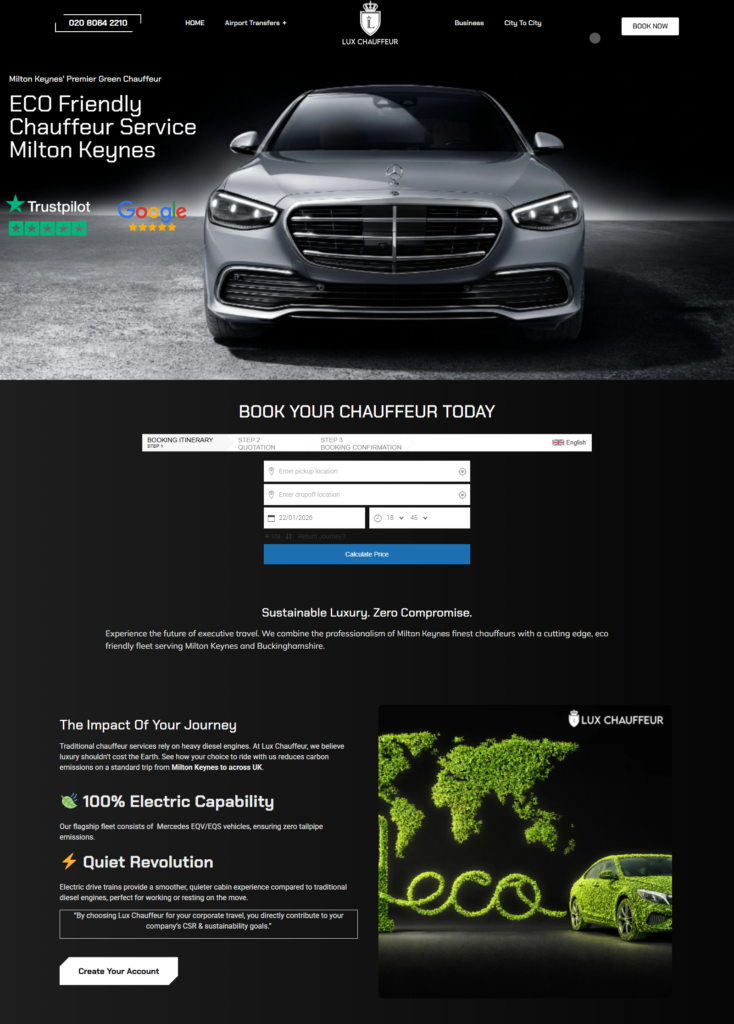 A WordPress website developed for a premium taxi and chauffeur booking service in the UK, allowing users to view services, browse luxury vehicle options, and book professional chauffeur rides online with a clean and responsive design.